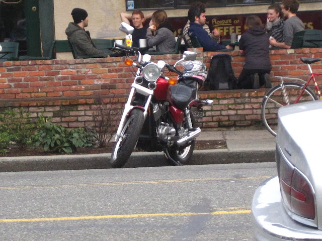 I was finally feeling better today! I went for a quick jaunt to meet up with Kiwi Deb for a a very short ride. I need to blow out the cob webs from the cold. It wasn't a long ride, in fact just a quick one. We decided to go to the Cook Street Village and either go to Moka house (this is where riders hang out) or Starbucks. We pulled up as cool as two old ladies can be and parked our bikes in front of Moka House and then walked over to Starbucks. The counter dude was pretty impressed that we were riding motorcycles, he sheepishly told us he rides a 50cc Vespa, I don't think he was expecting our response we both told him you have to start somewhere in your moto adventure. I asked him if he wears gear, he said he did which gives him extra ** in my book. He asked for a name to put on the lattes and then he said "Naw I will call you the Moto Mamas" Too funny they called out Moto Mamas when the lattes were ready. We took them outside to chill and chat on the patio. It was nice just to be outside and enjoying some fresh air. Deb and I had a quick visit and then it was time to roll, I had pizza to make & get Moto Daughter & friend off to see the Hedley concert. I snapped some pics as we were sitting on the patio.